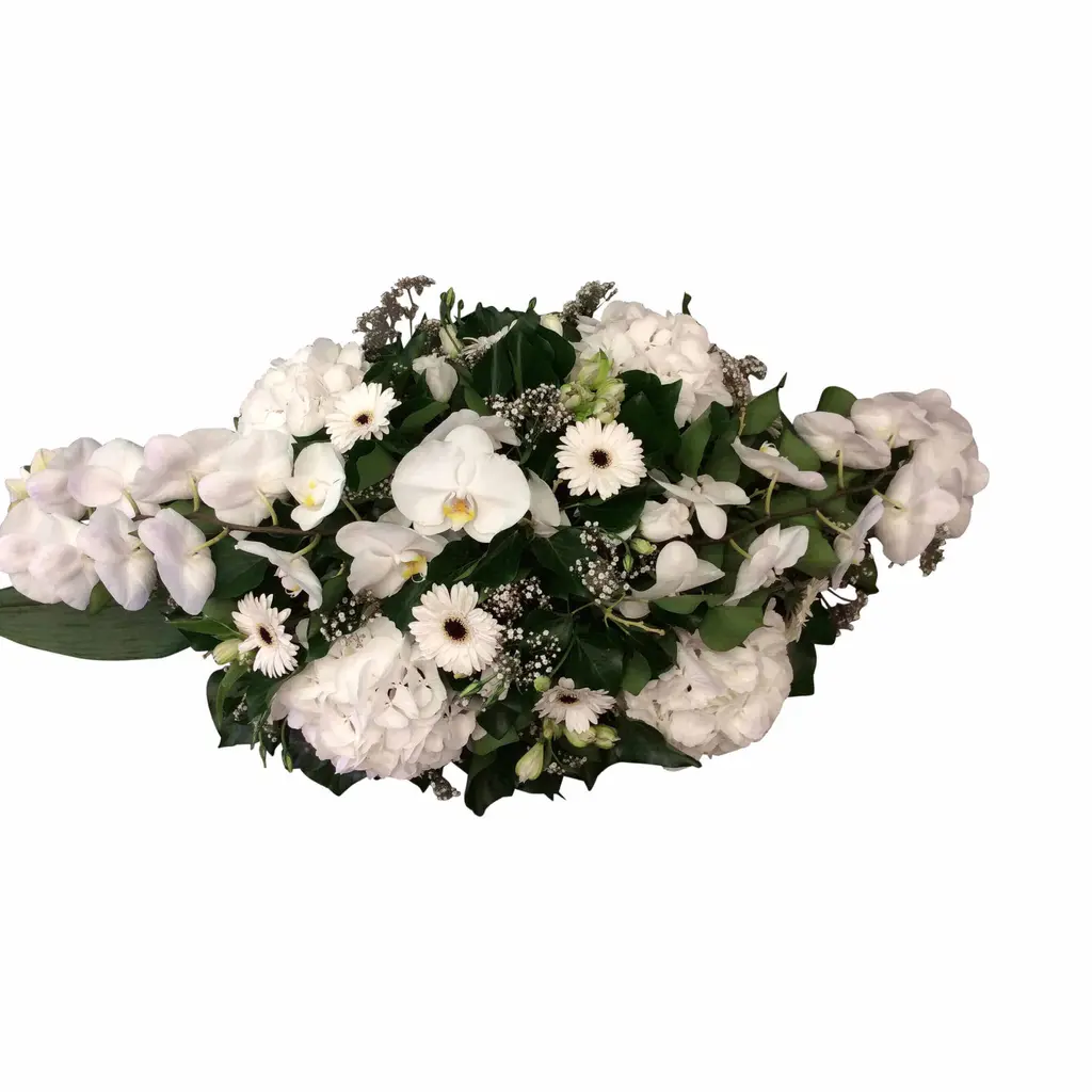 Let a loving and serene farewell speak with our handmade modern white funeral grave arrangement with orchids and germini in Kalmthout. Perfect for a funeral or cremation, with soft tones that bring peace and connection.