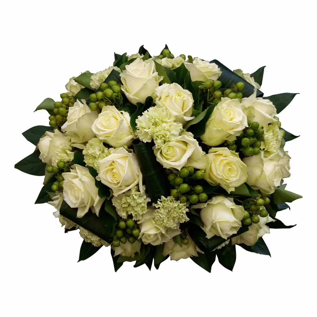 This soft and richly filled biedermeier funeral arrangement is composed of beautiful white and green-toned flowers, creating a calm and harmonious appearance. The natural colour palette symbolises peace, purity and remembrance.