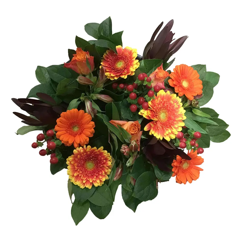 Le Bouquet Orange & Rouge apporte une touche joyeuse et chaleureuse à votre intérieur. Ce bouquet luxueux combine de magnifiques fleurs orange et rouges avec des accents de saison — parfait comme cadeau ou centre de table.