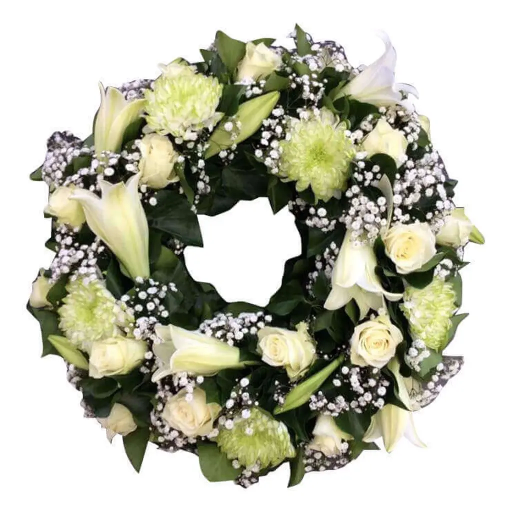Notre couronne standard contient des roses blanches, lys blancs et accents de gyps, complétée par du feuillage de saison pour une finition élégante.