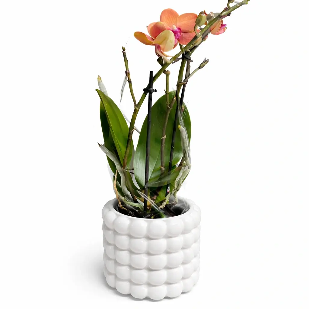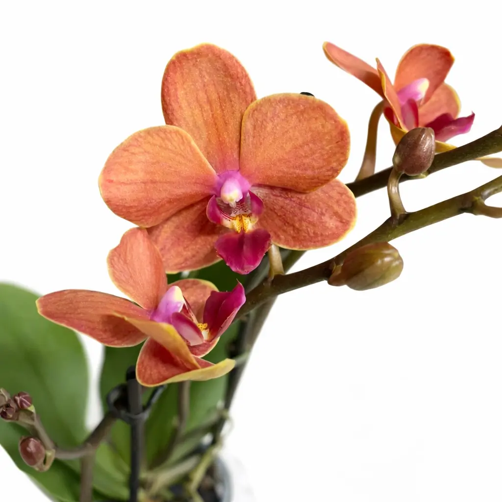 Apportez une atmosphère ensoleillée et chaleureuse à votre intérieur avec l'Orchidée Bolzano. Cette orchidée unique se distingue par ses magnifiques fleurs d'un orange profond qui attirent immédiatement le regard. Ses tiges élégantes et ses feuilles vertes luisantes font de cette plante un ajout luxueux pour tout salon, bureau of un cadeau d'exception.