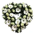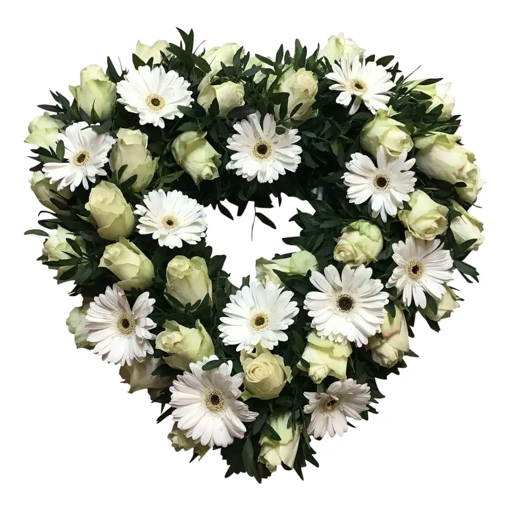 Hommage funéraire cœur ouvert avec roses blanches et germinis – Fait main et livraison personnelle Kalmthout