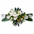 Composition florale funéraire moderne composée de roses blanches, de germes blancs, d'anthurium blanc, .... avec un accent de fines fleurs jaunâtres en combinaison avec de la verdure. Tombeau d'environ 70 cm.