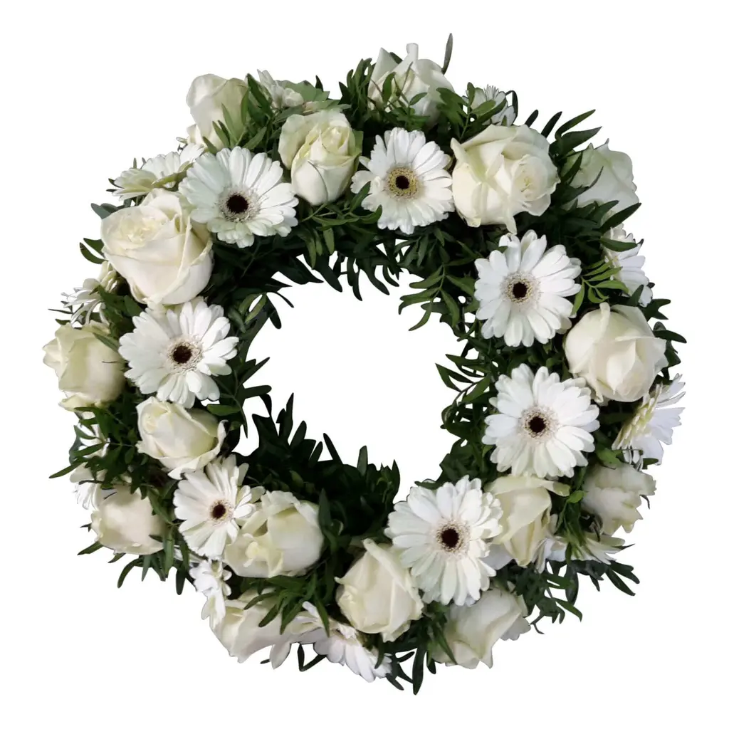 Couronne Funéraire Blanche avec Roses & Germinis – Artisanale à Kalmthout