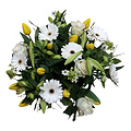Het Boeket Wit en Geel brengt een vrolijke en elegante mix van lichte tinten in je interieur. Dit luxe boeket combineert witte en gele bloemen, fris groen en subtiele accenten — perfect als cadeau, voor je woonkamer of als sfeermaker op tafel.