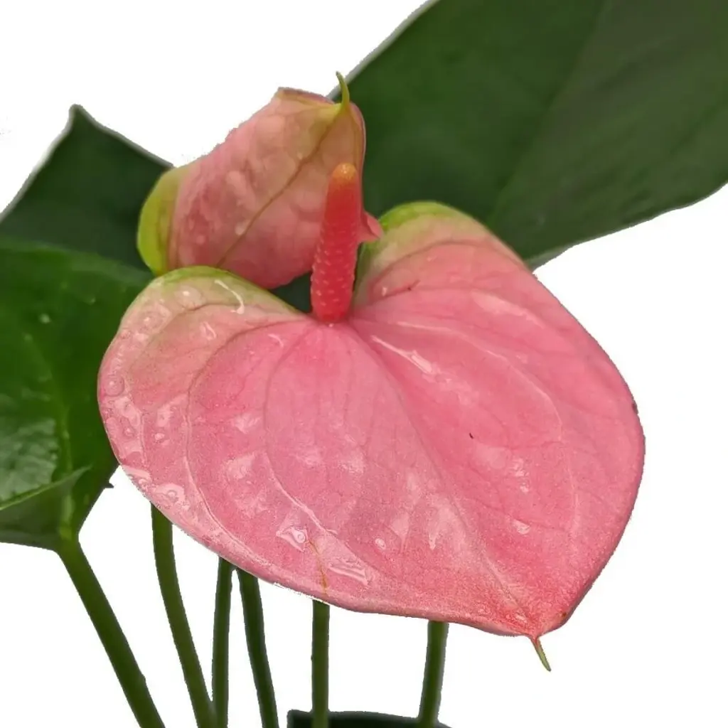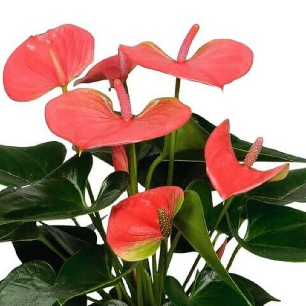 De Flamingoplant in roze is een van de weinige bloeiende kamerplanten die het hele jaar door bloemen produceert. De elegante, roze Anthurium-bloemen vallen direct op en combineren prachtig met het diepe groene blad. Dankzij zijn eenvoudige onderhoud is deze plant perfect voor thuis, maar ook voor op kantoor.