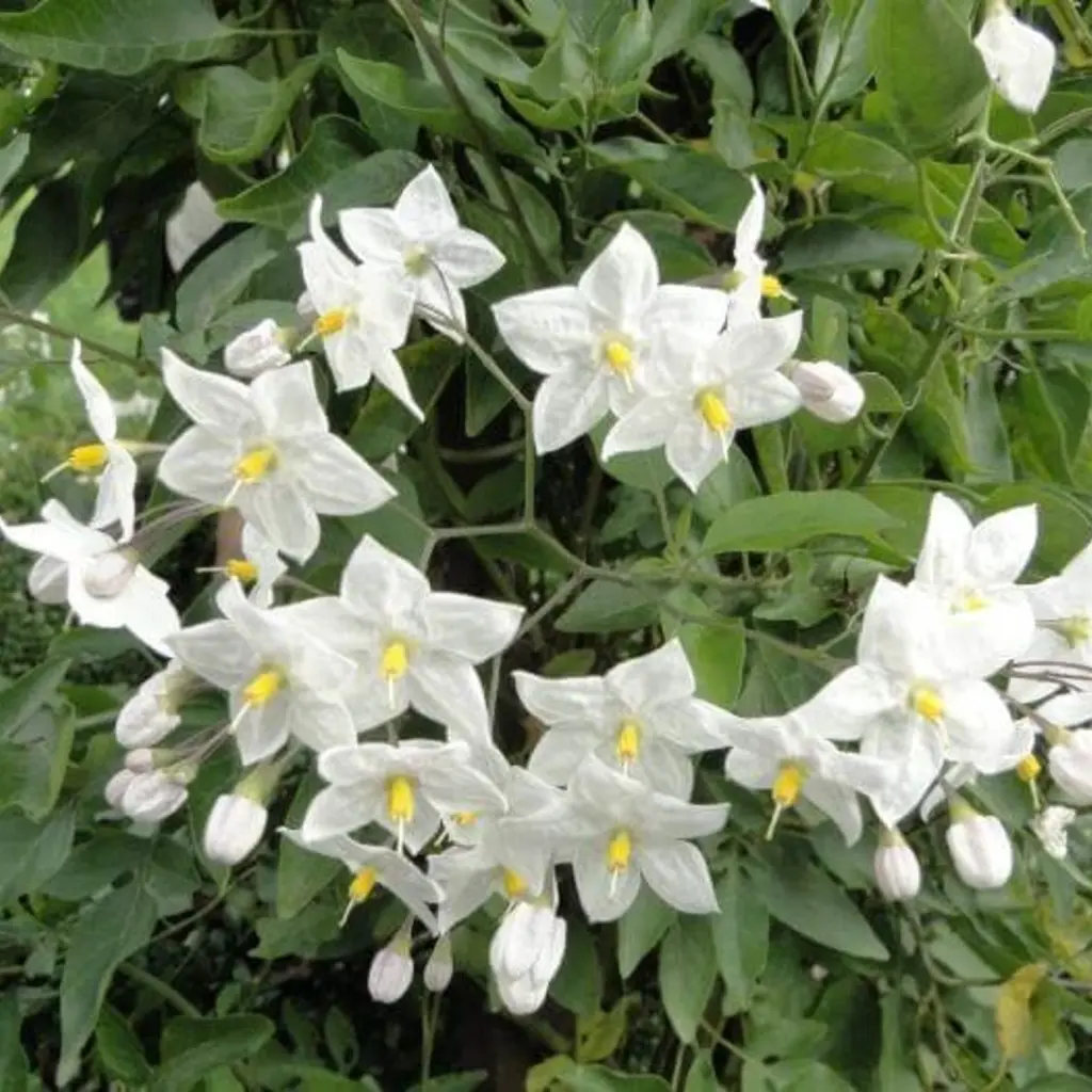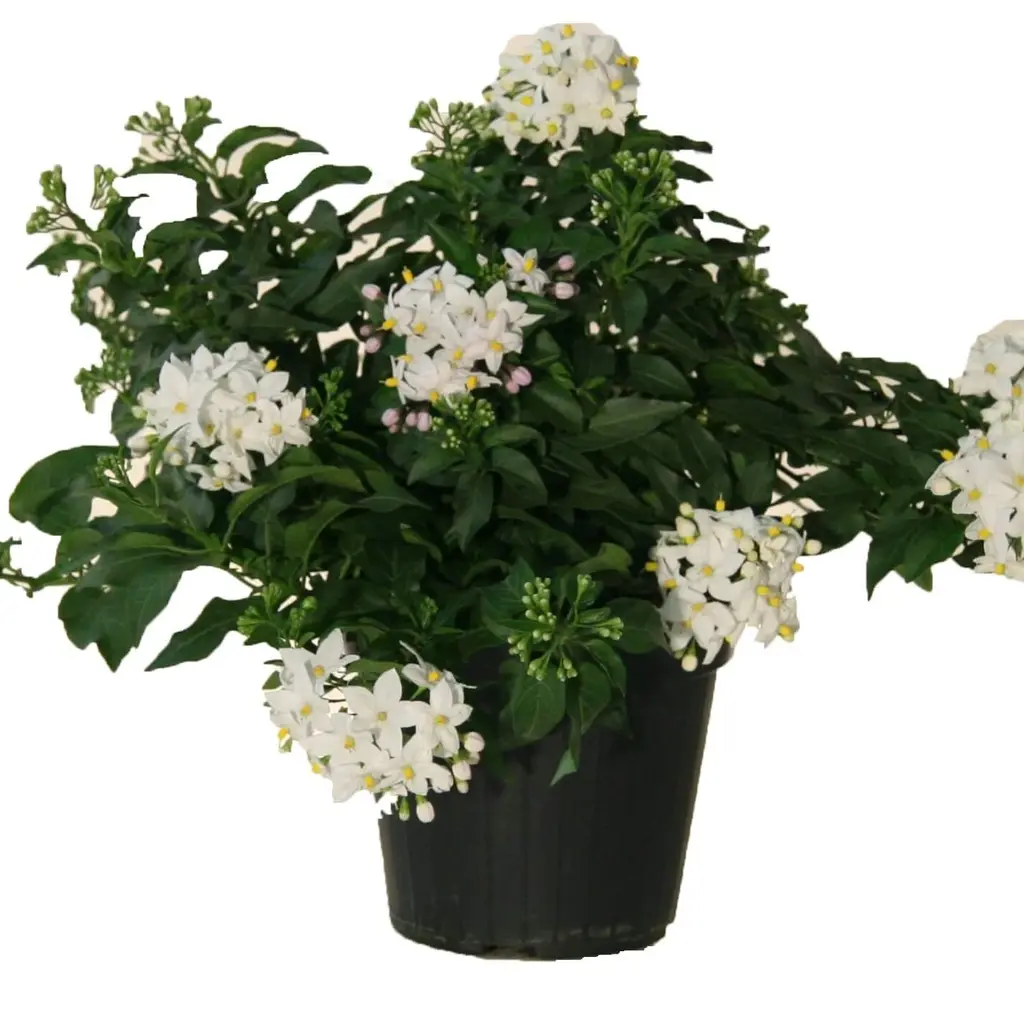 De Klimmende of Hangende Nachtschade is een snelgroeiende kuipplant die je moeiteloos langs een klimrek laat leiden of sierlijk laat hangen in een hangpot. Van mei tot oktober geniet je van een onafgebroken bloei met opvallende, stervormige witte bloemen die een heerlijke geur verspreiden.
