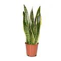 De Vrouwentong (Sansevieria trifasciata 'Laurentii') is een robuuste en onderhoudsvriendelijke kamerplant met rechtopstaande donkergroene bladeren met opvallende gele randen. Perfect voor vensterbank, bureau of lichte hoeken van je woonkamer. Dankzij de eenvoudige verzorging kunnen zowel beginnende als ervaren plantenliefhebbers genieten van een stijlvolle en luchtzuiverende plant.
